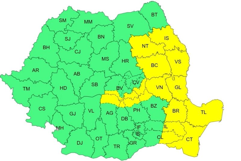În județele Vaslui, Bacău, Vrancea, Galați, Buzău, Prahova, Brăila, Ialomița, Călărași, Constanța, Tulcea, Ilfov și în municipiul București, vântul va avea intensificări cu rafale de 50...70 km/h.