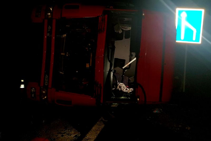 Drumul dintre Craiova și Slatina, blocat de un TIR răsturnat. Traficul rutier se desfășoară pe o singură bandă - VIDEO