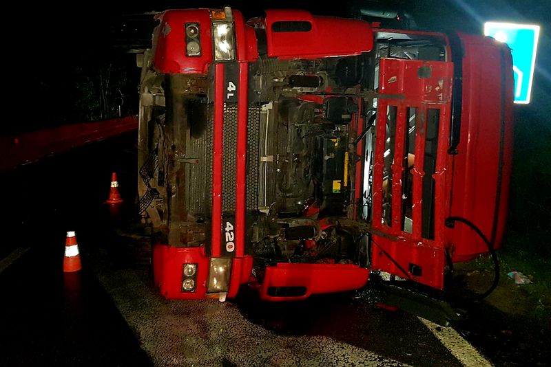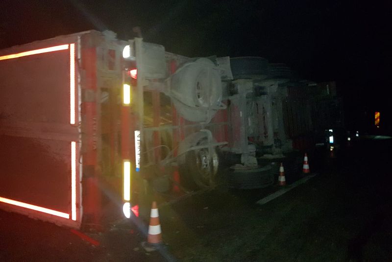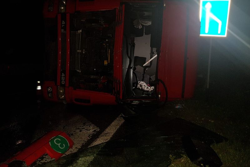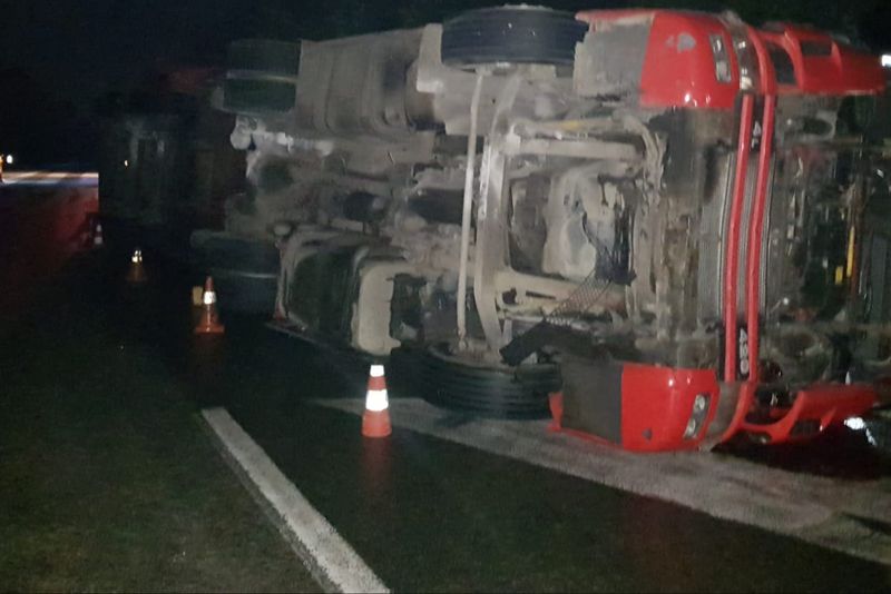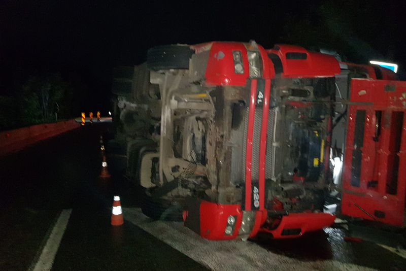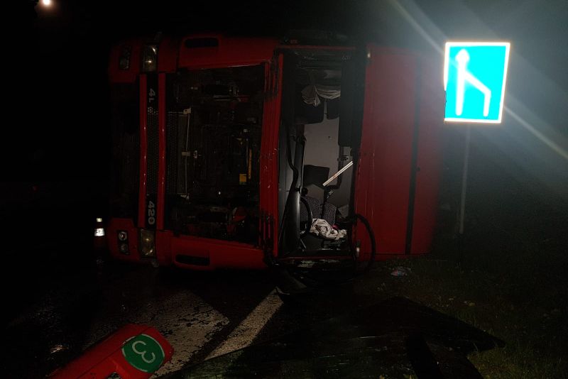 Potrivit polițiștilor, accidentul s-a produs pe raza localității Găneasa. Șoferul autocamion, un cetățean sârb în vârstă de 31 de ani, a pierdut controlul volanului şi a lovit separatorul de sens, răsturnându-se pe carosabil.Circulaţia rutieră se desfăşoară îngreunat, pe câte o bandă a fiecărei direcţii, urmând ca pe parcursul zilei de astăzi autovehiculul să fie repus pe roţi şi înlăturat de pe suprafaţa carosabilă.Purtătorul de cuvânt al ISU Olt, Alin Băsășteanu, a declarat că șoferul nu a fost rănit, în urma evenimentului.„Accident rutier pe Drumul European 574, zona Pădurea Saru, implicat un autocamion încărcat cu cărămidă. Șoferul, cetățean sârb, în vârstă de 31 de ani, nu prezintă urme de traumă și refuză transportul la spital. La fața locului se află echipaje de pompierii care asigură măsurile de prevenire a situațiilor de urgență. Circulația a fost restricționată de echipajele de poliție și se desfășoară pe o singură bandă de circulație, în zona producerii accidentului. La fața locului se va deplasa o macara pentru executarea manevrelor de ridicare a TIR-ului”, a declarat Băsășteanu.Și în urmă cu două săptămâni, tot în acest punct al drumului național DN 65, s-a răsturnat un alt TIR, traficul rutier fiind blocat atunci pentru 18 ore.