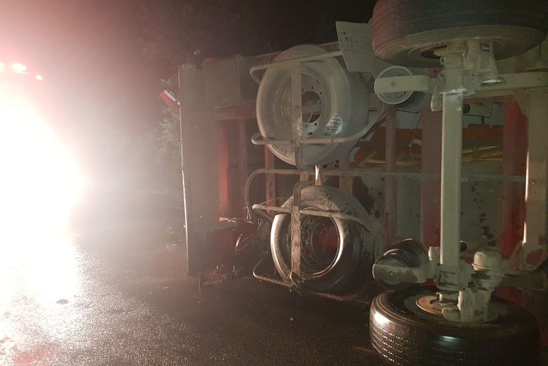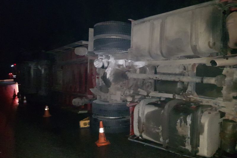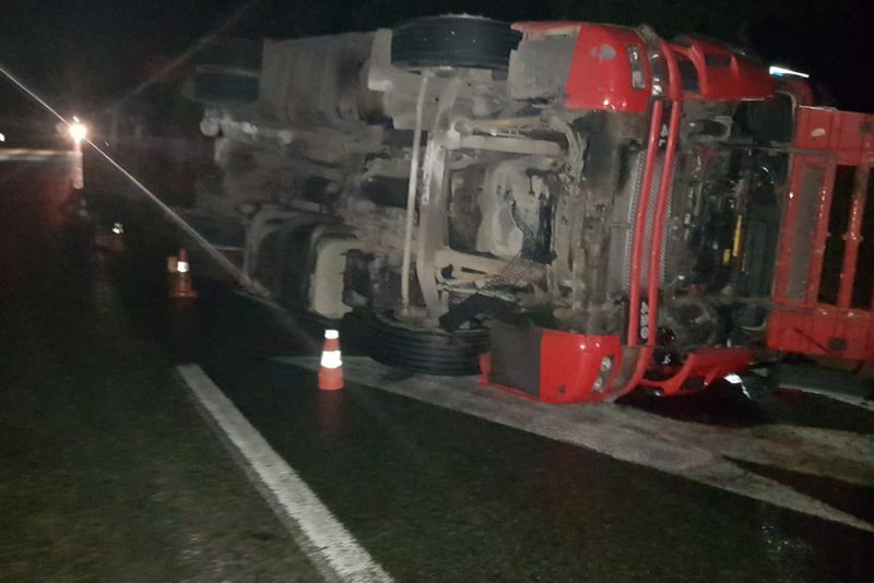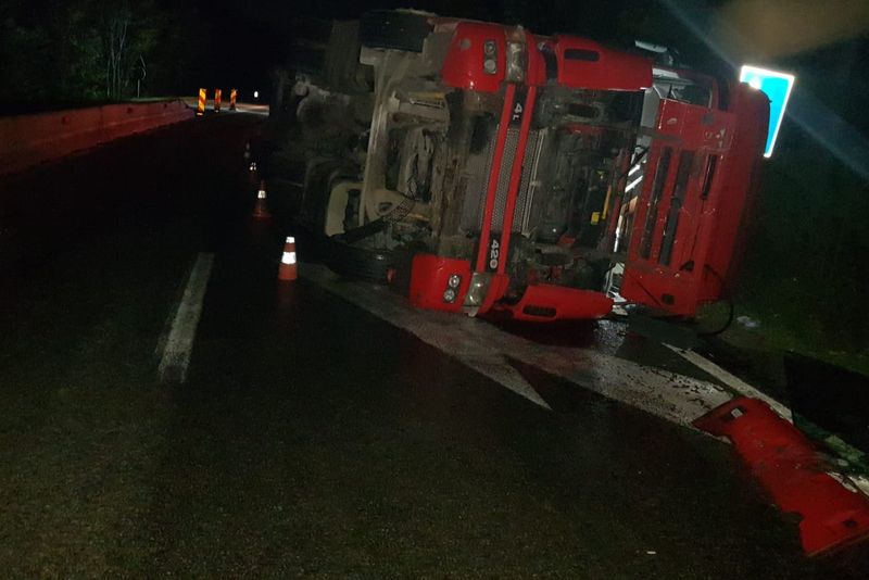 Traficul rutier se desfășoară cu dificultate, luni dimineață, pe drumul național DN 65, în zona Pădurii Saru, unde un autocamion încărcat cu cărămidă a lovit separatorul de sens și s-a răsturnat.