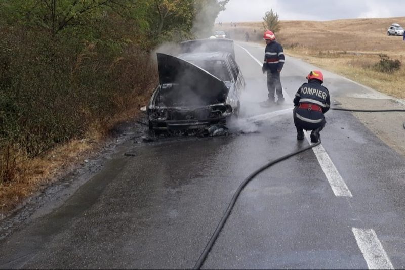 Un autoturism a fost mistuit de un incendiu, sâmbătă, pe drumul național DN 65, între localitățile Brebeni și Schitu.
