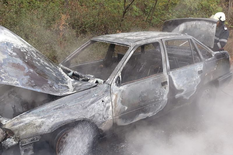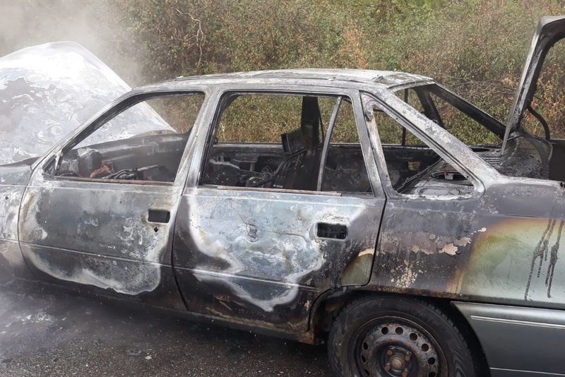 Imagini șocante. Autoturism distrus de un incendiu, pe un drum județean din Olt