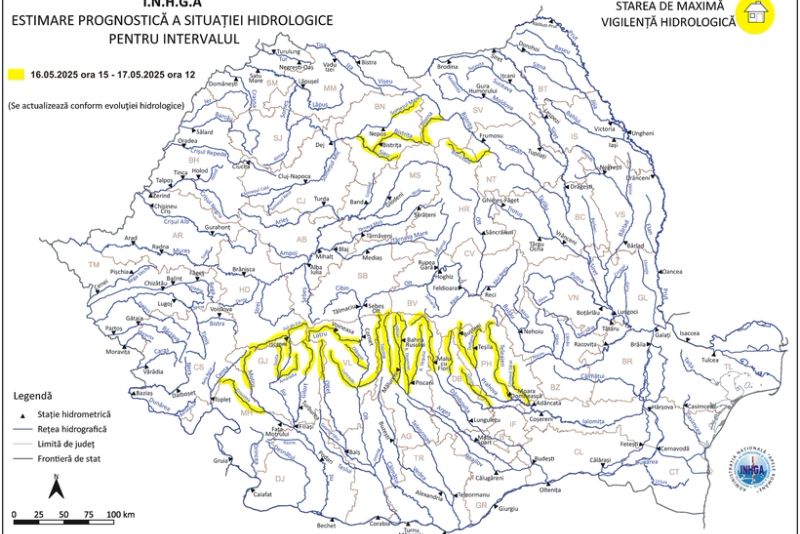 Institutul Național de Hidrologie și Gospodărire a Apelor (INHGA) a emis vineri o avertizare Cod galben de inundații și viituri rapide, valabilă în 13 județe