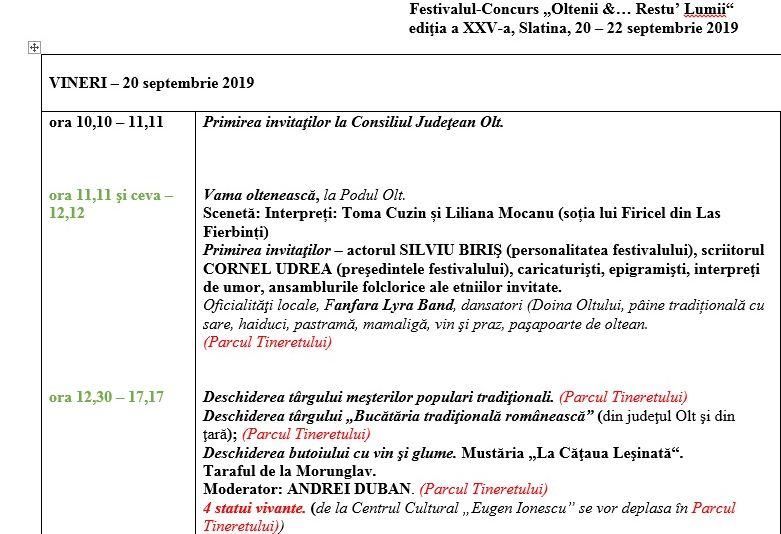 Ediția a XXV-a a festivalului „Oltenii & Restu’ lumii” începe mâine, la ora 11.00, la Slatina. Invitații, dar și organizatorii vor merge mai întâi la Podul Olt, unde are loc deschiderea oficială a evenimentului, cu praz, mămăligă, pastramă și vin. Apoi, celebrii Firicel și soția sa, din serialul Las Fierbinți, vor juca o scenetă comică pentru spectatori.