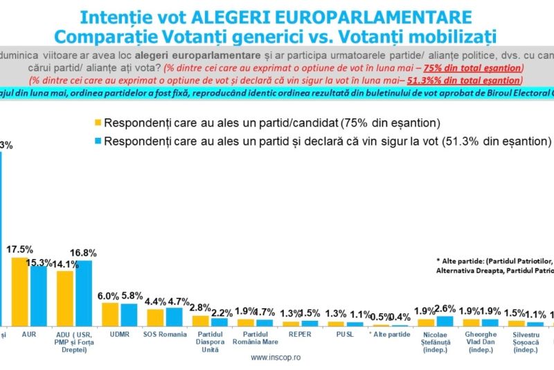 Intenţia de vot la alegerile europarlamentare raportată la votanţii mobilizaţi (respondenţii care îşi exprimă preferinţa pentru un partid/candidat din listă şi care declară că vin în mod sigur la vot – 51,3% din total eşantion) şi votanţii generici (respondenţii care îşi exprimă preferinţa pentru un partid/candidat din listă indiferent dacă declară că vin sau nu vin la vot în mod sigur - 75% din total eşantion).